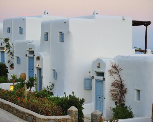 Τα κτίρια χαρακτηρίζονται από όγκους που διατάσσονται ο ένας δίπλα στον άλλο με υψομετρική διαφορά ακολουθώντας την φυσική στάθμη του εδάφους. Αυτή η διαφορά στάθμης συναντάται πολύ συχνά στις όψεις των σπιτιών κατά μήκος των δρόμων της Μυκόνου.