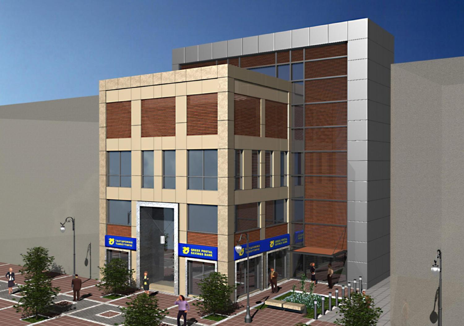 Έμφαση δόθηκε στην χρήση υλικών της εταιρικής ταυτότητας του Ταχυδρομικού Ταμιευτηρίου, αλλά και στην διαφοροποίησή τους στο κομμάτι εκείνο του κτιρίου που στεγάζονται οι γραφειακοί χώροι και δεν αποτελούν μέρος του καταστήματος. Η διαφοροποίηση αυτή επιτυγχάνεται με την δημιουργία δύο κτιριακών όγκων.