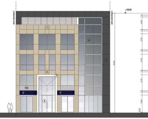 Προκειμένου το κτίριο να αποτελεί ένα ενιαίο σύνολο, χρησιμοποιήθηκε ο ίδιος χρωματισμός στα κουφώματα αλουμινίου των υαλοστασίων και στους δύο όγκους, καθώς επίσης και το στοιχείο των περσίδων, που προστατεύουν από τον δυτικό ήλιο.