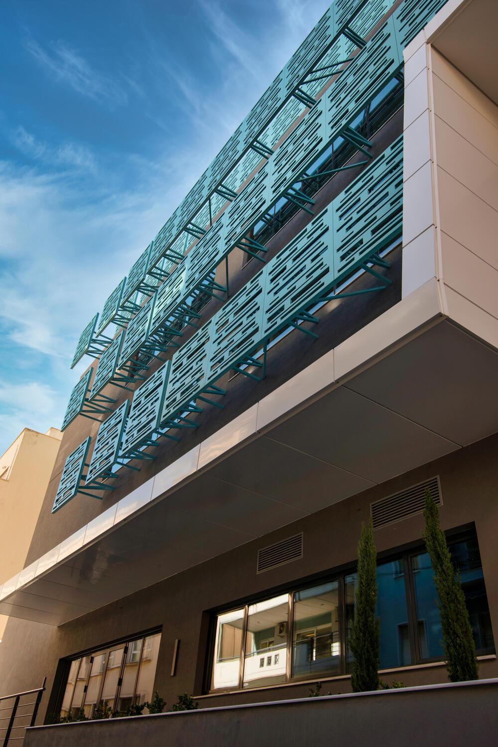 Ιδιαίτερη προσοχή έχει δοθεί στη μορφή και τη χωροθέτηση του νέου κτιρίου, ώστε αφενός να εντάσσεται αρμονικά στο υπάρχον δομημένο περιβάλλον και στη γεωμορφολογία της περιοχής και αφετέρου να ξεχωρίζει. Το βασικό στοιχείο της μορφολογικής λύσης που επιλέχθηκε είναι η χρήση διάτρητων πάνελ σάντουιτς από αλουμίνιο, στο χρώμα του οξειδωμένου χαλκού. Τα πάνελ λειτουργούν ως σκίαστρα στην κύρια όψη που έχει νότιο προσανατολισμό και στις πίσω όψεις, που οι απαιτήσεις για σκίαση είναι μικρότερες, εμφανίζονται ως ‘’στηθαία’’ ολοκληρώνοντας αισθητικά το σύνολο του κτιρίου.